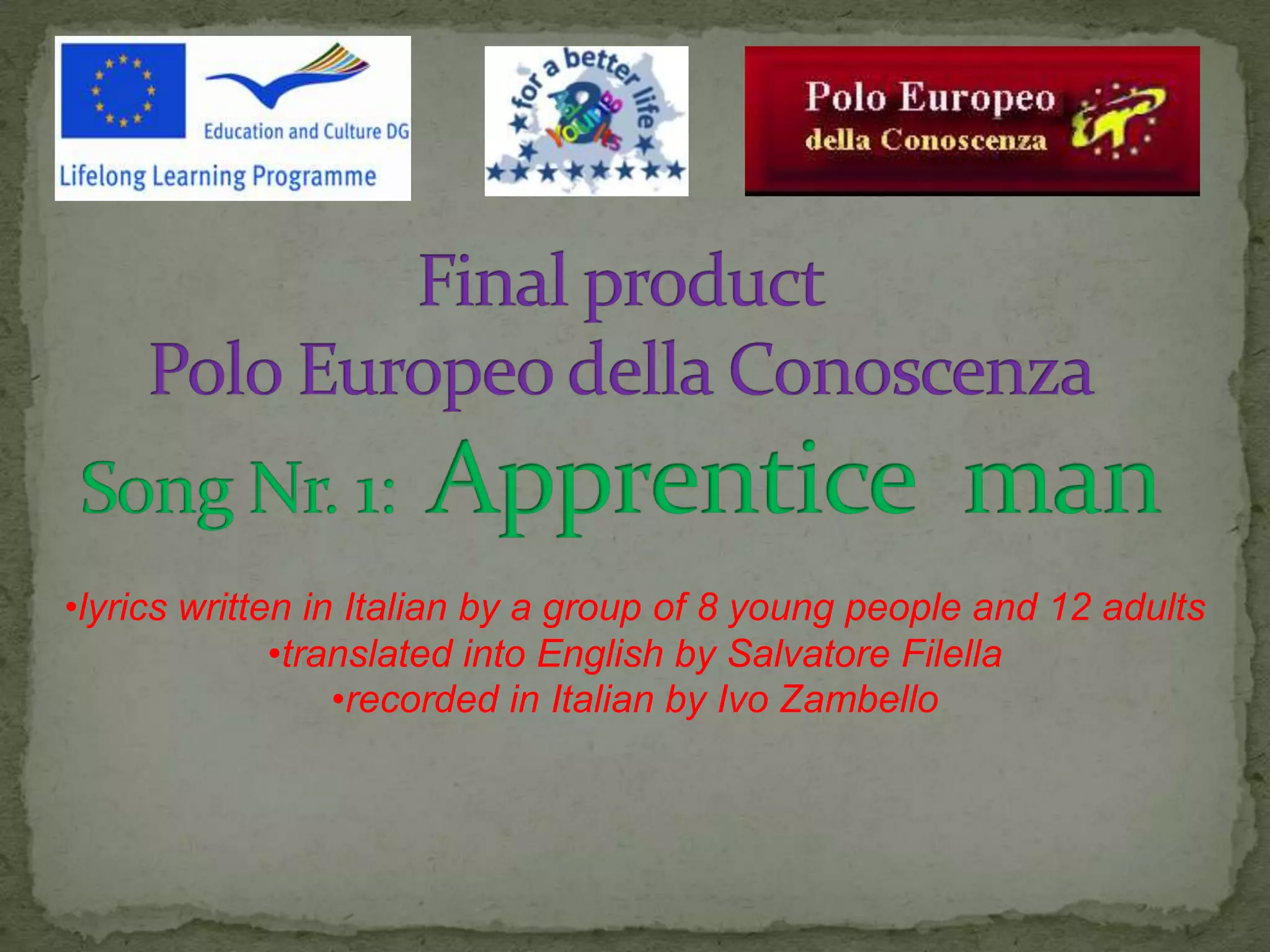 The document contains the lyrics of a song written in Italian by a group of young people and adults. The lyrics were translated to English and recorded in Italian by a singer. The song discusses a child asking an old man for advice on how to live life and handle challenges that come from above as the snow melts unexpectedly.