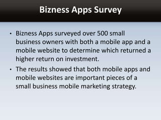 The document compares mobile apps and mobile websites for small businesses. A survey of over 500 small businesses found that 73% reported higher returns on investment from mobile apps compared to 27% for mobile websites. Customers also preferred apps over mobile websites, with 81% preferring apps. Both apps and mobile websites are important for small businesses, with 81% saying they are equally important. Apps provide benefits like increased customer loyalty, push notifications, and access to hardware functions. However, mobile websites have advantages like lower costs and not requiring installation. The document promotes developing both a mobile app and website for a complete mobile marketing strategy.