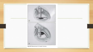 2. Clinical evaluation of ptosis involves measuring the margin-reflex distance, palpebral fissure height, and levator function to determine severity.