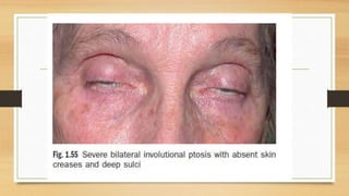 1. Ptosis, or drooping of the upper eyelid, can be congenital or acquired through various mechanisms including myogenic, neurogenic, mechanical, or aponeurotic causes.