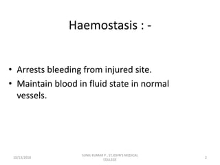 This document discusses laboratory approaches to evaluating bleeding disorders and mixing studies. It begins by explaining haemostasis and the coagulation cascade. It then discusses evaluating patients by obtaining a history, physical exam, and laboratory tests. A variety of screening and specific laboratory tests are outlined to identify abnormalities in coagulation factors, platelets, fibrinogen and the presence of inhibitors. The principles, reagents and procedures for performing various coagulation tests like PT, APTT, thrombin time and mixing studies are detailed.