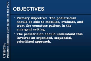 The document provides guidance for pediatric residents on evaluating and managing comatose children. It outlines the primary objectives of stabilizing the patient by addressing airway, breathing and circulation. Causes of coma are categorized as those with focal neurological signs, those without focal signs but with meningeal irritation, and those without either. A thorough history, physical exam including Glasgow Coma Scale, and neurological assessment are recommended to identify potential causes and guide management and treatment. Specific etiologies like infections, metabolic disturbances, trauma and others are discussed. Ongoing monitoring for changes is also advised.