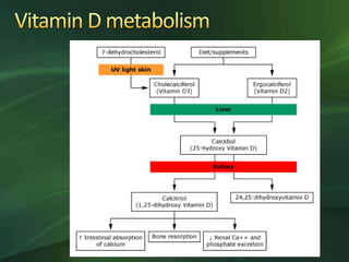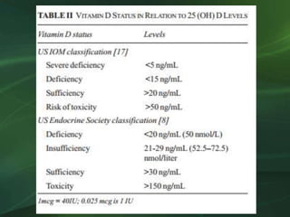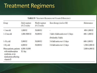 The document outlines vitamin D intake recommendations for various age groups, emphasizing the higher needs during pregnancy and lactation, especially for certain populations like those with obesity or on specific medications. It also discusses treatment for vitamin D deficiency and the importance of calcium supplementation during therapy. Recommendations include administering high doses of vitamin D to breastfeeding mothers and fortifying food to ensure adequate intake.
