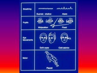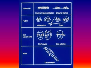 The document provides guidance on approaching and managing a comatose patient. It outlines that the primary objectives are to stabilize, evaluate, and treat the patient by taking an organized sequential approach that prioritizes the airway, breathing, circulation, treating metabolic causes of coma like hypoglycemia, and evaluating for increased intracranial pressure or mass lesions. Secondary objectives include understanding the signs and symptoms of different causes of coma and developing a differential diagnosis. The document then provides detailed information on assessing different aspects of the comatose patient including their level of consciousness, neurological exam findings, breathing patterns, eye movements, motor response, and appropriate investigations.