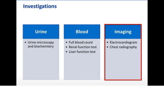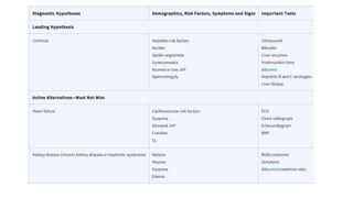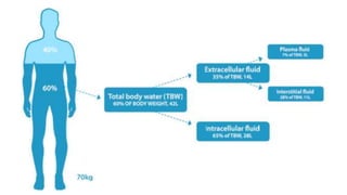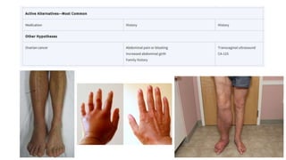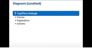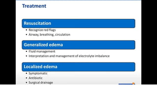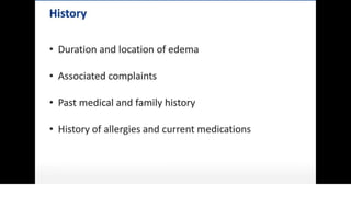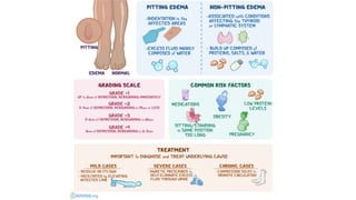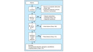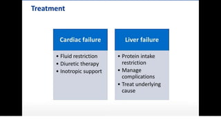 The document outlines edema as a condition characterized by swelling due to the accumulation of interstitial fluid, triggered by factors such as increased capillary pressure or permeability, and lymphatic obstruction. Treatment focuses on addressing the underlying causes, dietary restrictions, supportive measures, and appropriate use of diuretics while monitoring for potential complications. Key points include careful management of fluid intake, especially in cases of severe hyponatremia, and the risks associated with overdiuresis in congestive heart failure.