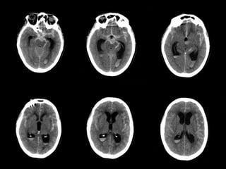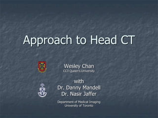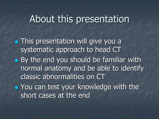 This document provides an overview of how to systematically analyze a head CT scan. It begins with identifying basic scan details and checking for previous studies. It then reviews CT fundamentals like Hounsfield units and image planes. The document outlines an approach of analyzing midline structures, ventricles, cisterns, brain parenchyma, sulci, sinuses, and bones. It provides examples of common abnormalities and how to identify acute vs. chronic hemorrhages. The goal is to familiarize readers with head CT anatomy and classic abnormalities.