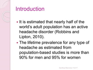Dr. Sandhya Manorenj provides an overview of approaches to headache and migraine. Nearly half of adults worldwide have an active headache disorder. History taking follows the SOCRATES method and examination evaluates for signs of increased intracranial pressure. Investigation may include neuroimaging like CT or MRI to identify underlying causes. Treatment involves acute and preventative medications that vary depending on the headache type, like triptans for migraines or verapamil for cluster headaches.