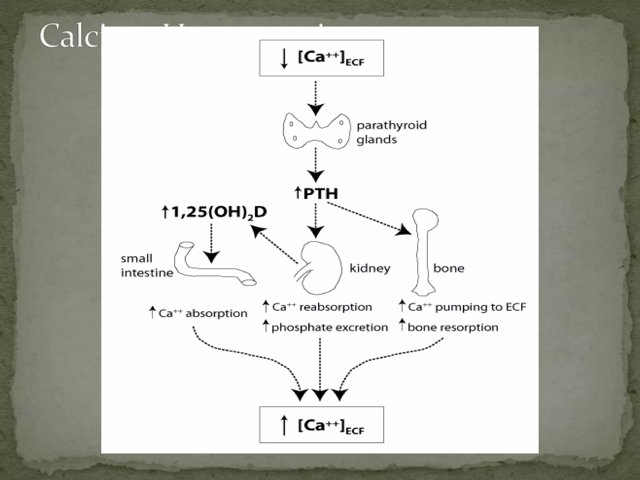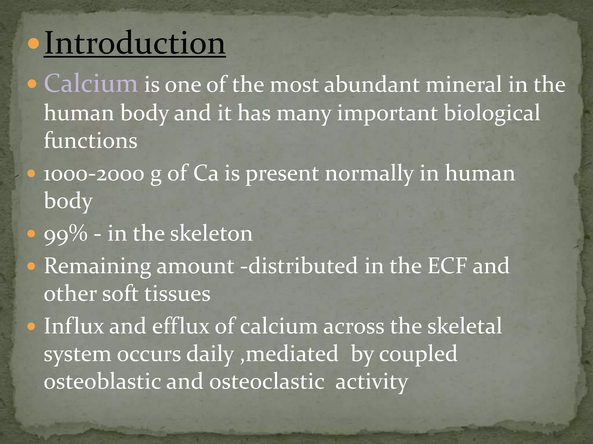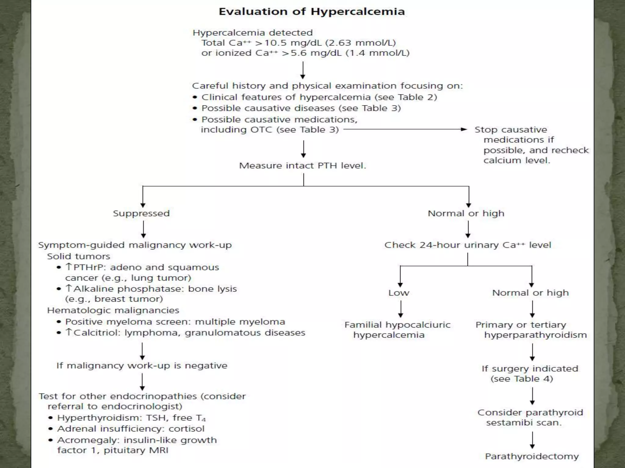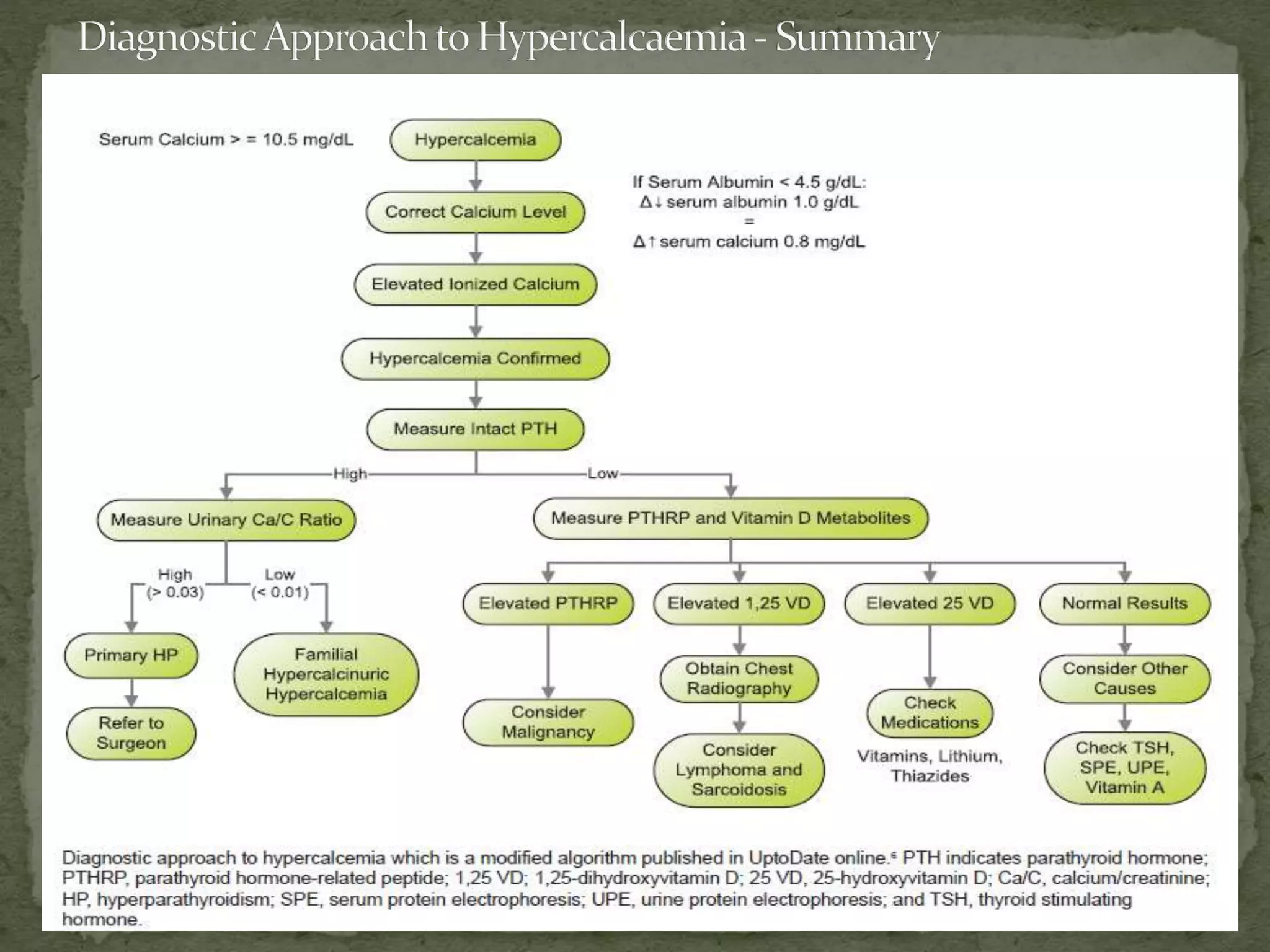 This document discusses calcium homeostasis and hypercalcemia. It notes that calcium is critical for many physiological functions and is mainly stored in bones. Hypercalcemia can be caused by primary hyperparathyroidism, vitamin D excess, certain malignancies, and other conditions. The diagnostic approach involves distinguishing between hyperparathyroidism and hypercalcemia of malignancy based on lab tests. Treatment focuses on rehydration, increasing calciuresis, and decreasing bone resorption or intestinal calcium absorption using medications like calcitonin, bisphosphonates, glucocorticoids, or dialysis depending on the severity of hypercalcemia.