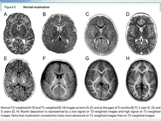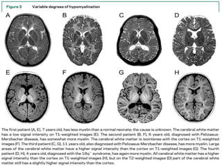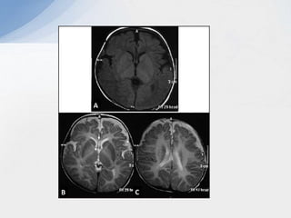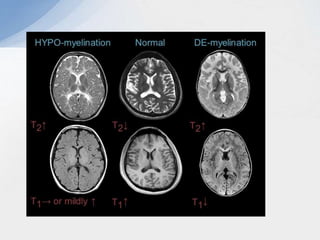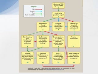 This document provides an overview of leukodystrophies and discusses their clinical presentation and neuroimaging features. It begins with definitions of leukodystrophies and outlines their age of onset. Common clinical features are then described, including neurological, non-neurological, ophthalmological, and radiological findings. A stepwise approach to the neuroimaging of leukodystrophies is presented, focusing on patterns of white matter involvement that can help differentiate genetic from acquired causes.
