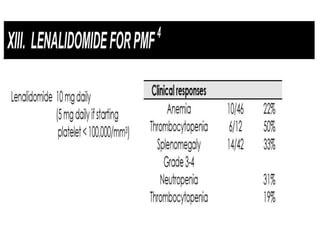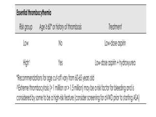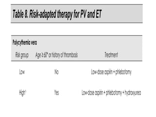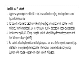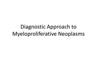 This document discusses the diagnostic approach and classification of myeloproliferative neoplasms according to the 2008 WHO criteria. It describes the differential diagnosis and clinical features of polycythemia vera, essential thrombocythemia, and primary myelofibrosis. It discusses diagnostic criteria, disease course, prognosis, and treatment approaches for these chronic myeloproliferative disorders.