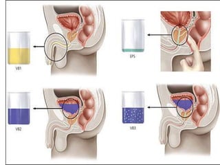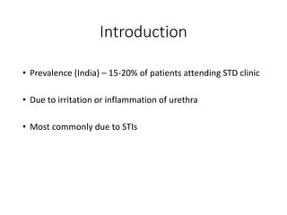 This document discusses the approach to evaluating and treating urethral discharge. It begins by outlining the common causes of urethral discharge including sexually transmitted infections like gonorrhea and chlamydia as well as non-sexually transmitted infections. It then describes the evaluation process including history, examination, laboratory investigations, and treatment guidelines. Evaluation involves identifying the cause through history, examination, testing urethral or urine samples, and treating based on identified causes. Common tests discussed include gram stain, culture, and point of care tests while recommended treatments follow guidelines. Drug resistance and follow up are also addressed.
