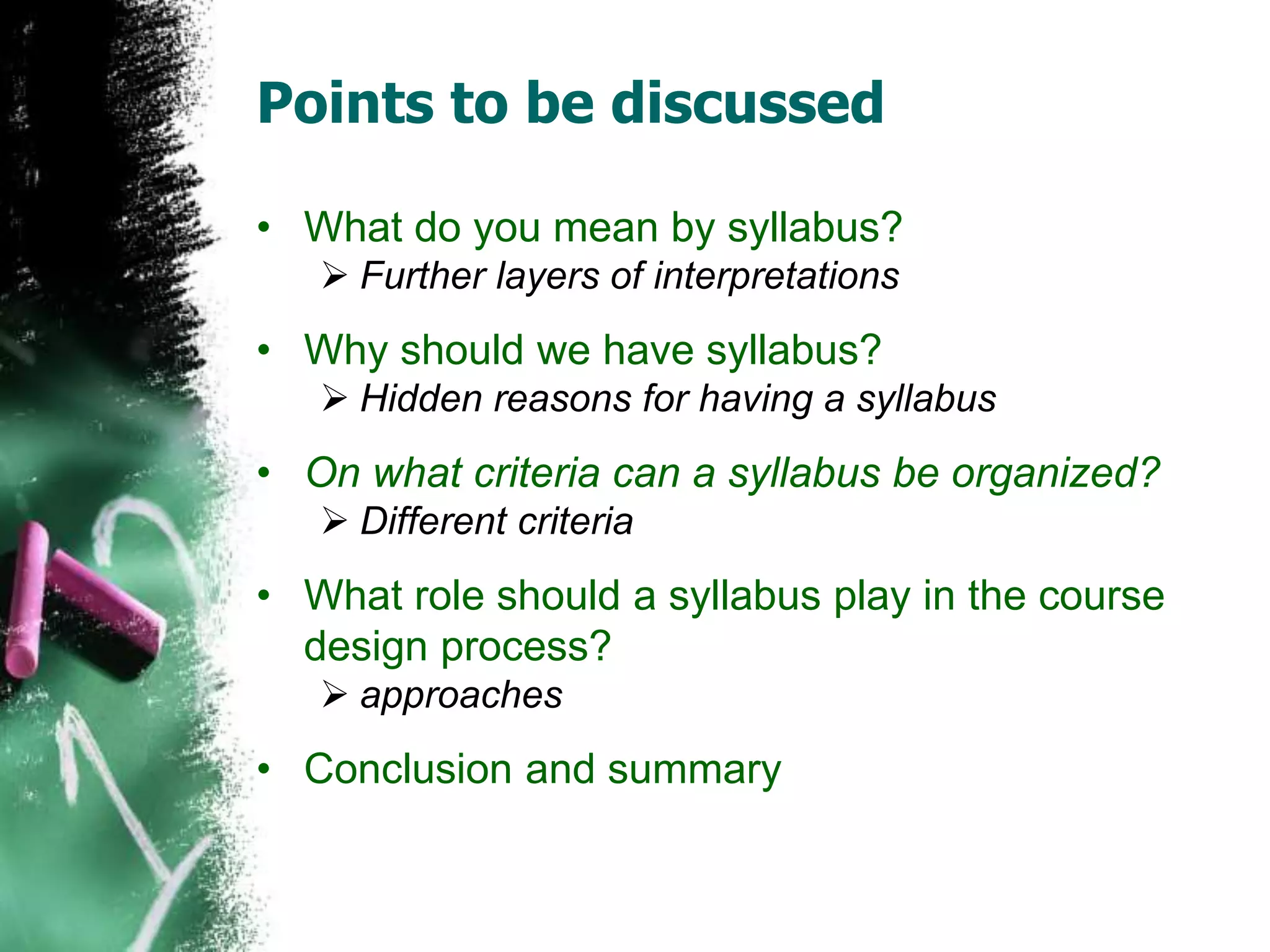 The document discusses the nature and importance of a syllabus in education, defining it as an outline of topics to be learned in a course. It explores various interpretations of syllabuses, including evaluation, organizational, materials, teacher, and learner syllabuses, emphasizing their roles in course design and the complexity of language acquisition. Additionally, it outlines the reasons for having a syllabus and different criteria for organizing syllabuses, along with approaches to course design.