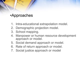 5. The social demand approach which aims to fulfill educational needs at all levels based on societal demands.