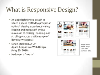 Responsive design provides an optimal viewing experience across devices by using fluid grids and layouts, flexible images and media, and media queries. Key elements include fluid grids based on percentages, media queries that detect device capabilities and alter styles, and flexible typography that scales with the base font size. Popular frameworks like Bootstrap simplify the process but can limit customization. Plugins also help add responsive features to sites.