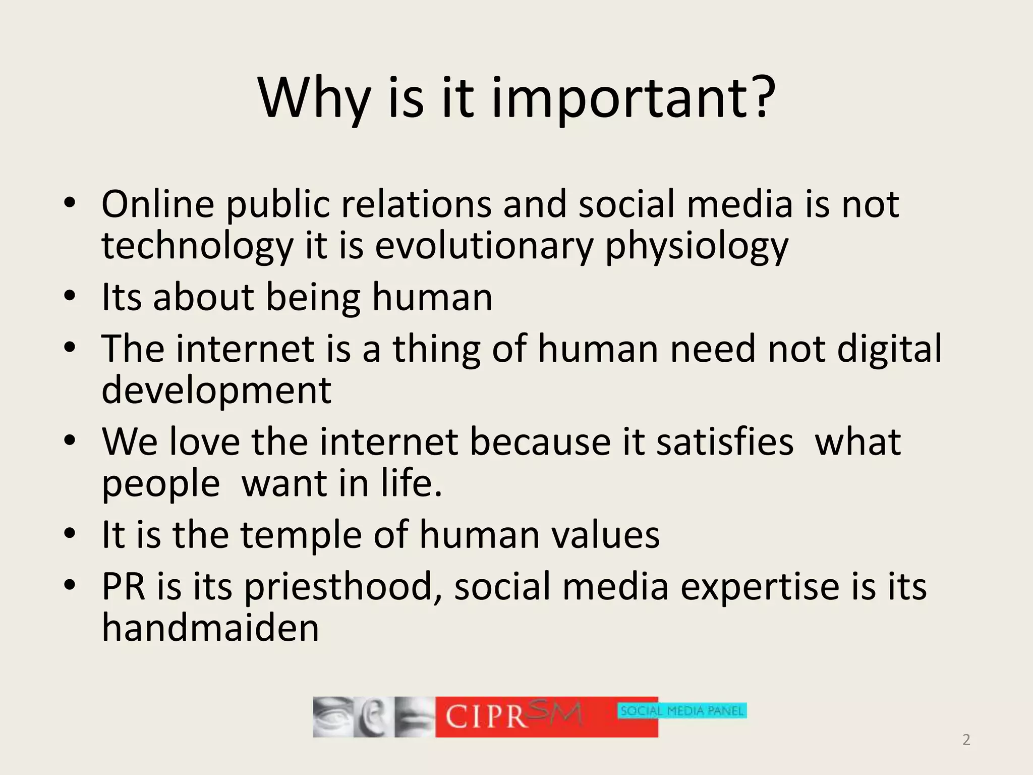 The document discusses how human evolution and psychology explain why people are drawn to use the internet and social media. It argues that the internet satisfies fundamental human needs and is an extension of human physiology. As humans evolved to be adaptive, inventive, and reliant on sharing knowledge through culture, the internet is a natural progression that allows sharing of information on a vast scale. This revolutionary change is about public relations, as PR helps spread values and knowledge to build relationships, which is what humans are programmed to do and what the internet now enables.