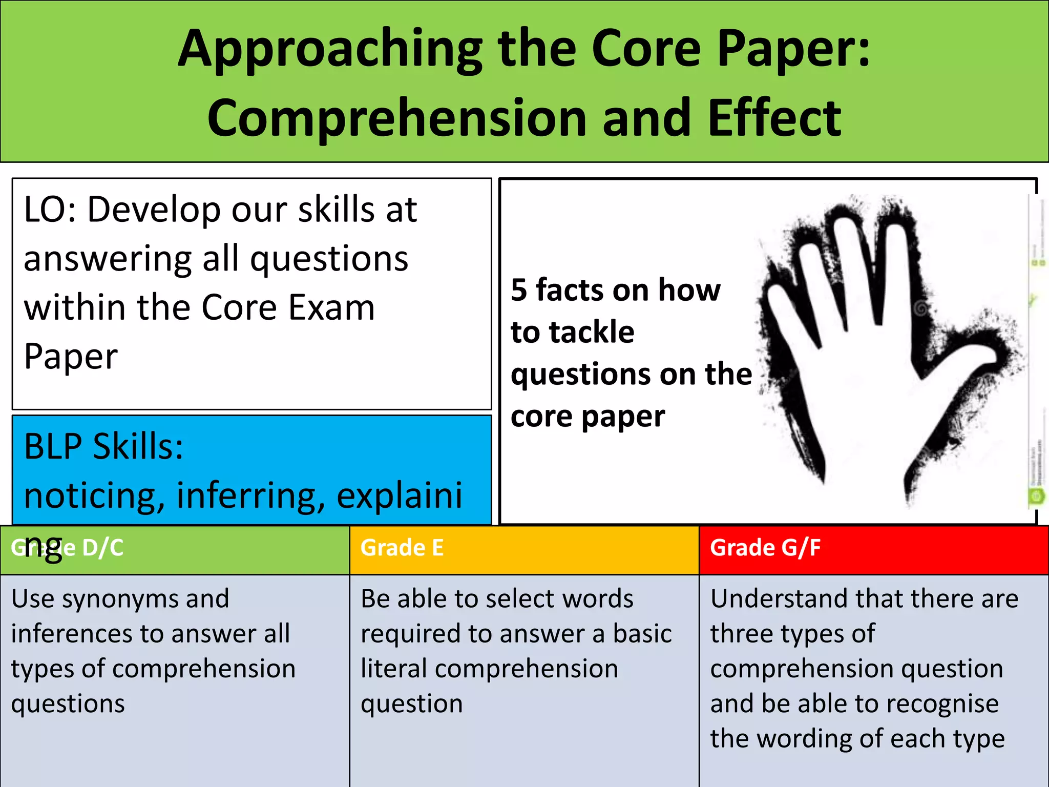 The document provides guidance on developing skills for answering questions in the Core Exam Paper. It outlines that there are three types of comprehension questions and emphasizes the importance of using synonyms and inferences to answer all question types. Specific advice includes being able to select words for literal comprehension questions, noticing details, inferring, and explaining. The document also lists 5 facts on how to tackle the different questions.