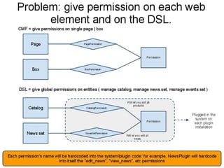The document discusses building a content management framework (CMF) using Symfony 1.4, PHP, MySQL and Apache. It suggests using Redis instead of memcached for faster in-memory storage. The CMF would allow customers to express domains through a web interface. Pages in the CMF would use a hierarchical tree structure and nested sets to organize content in boxes. The CMF would be pluggable and abstract different layers through inversion of control.