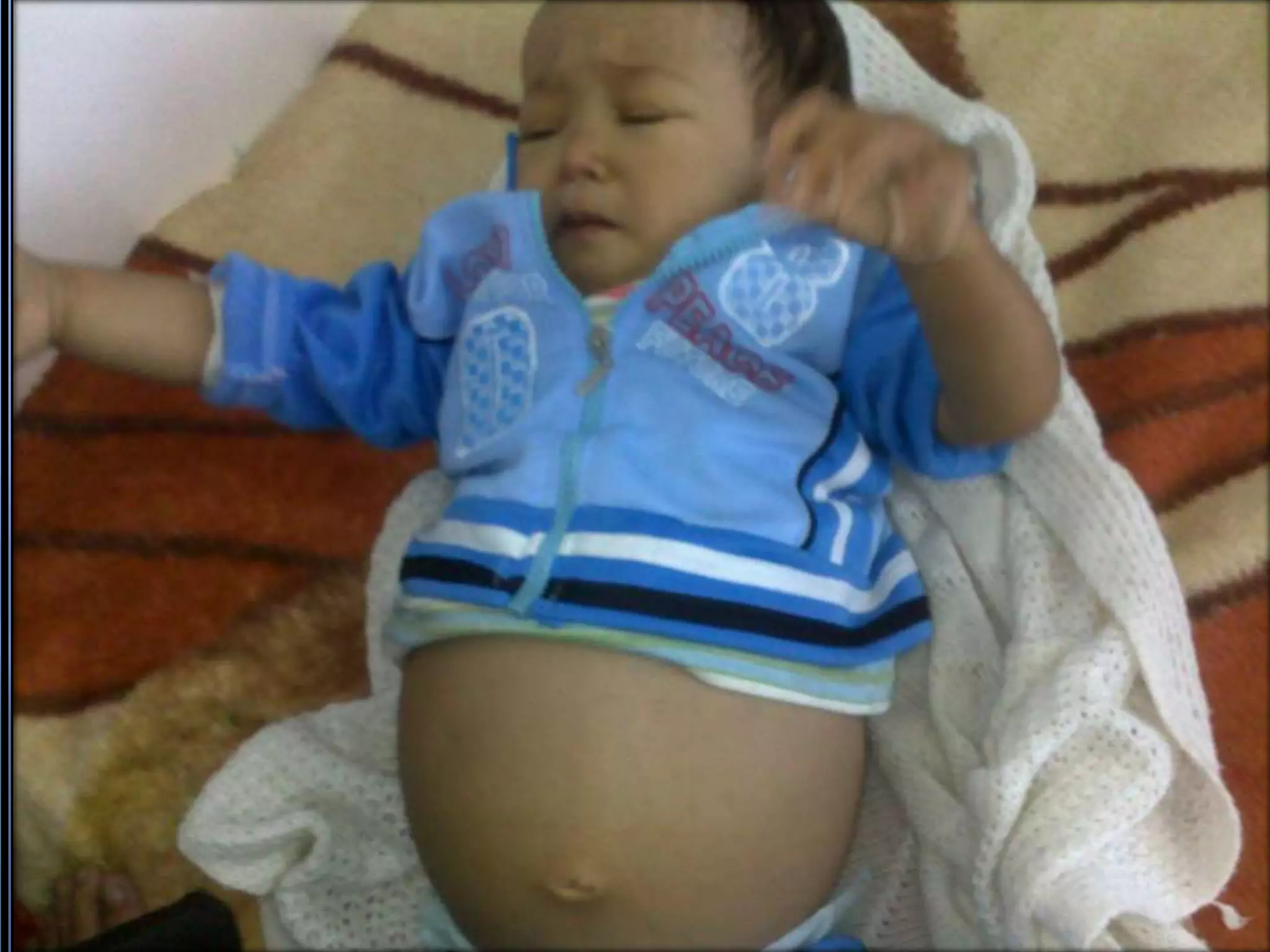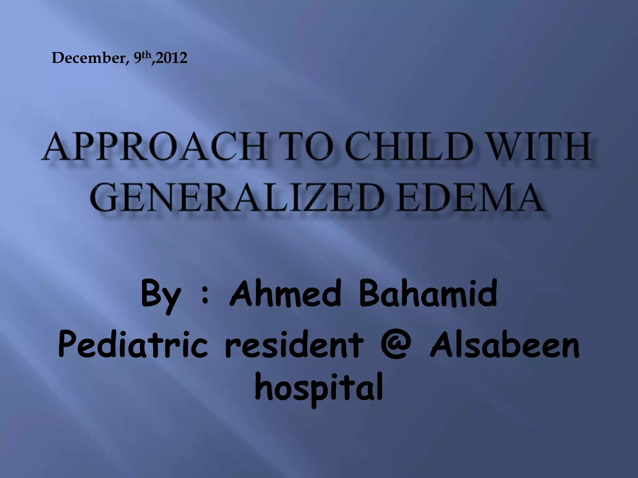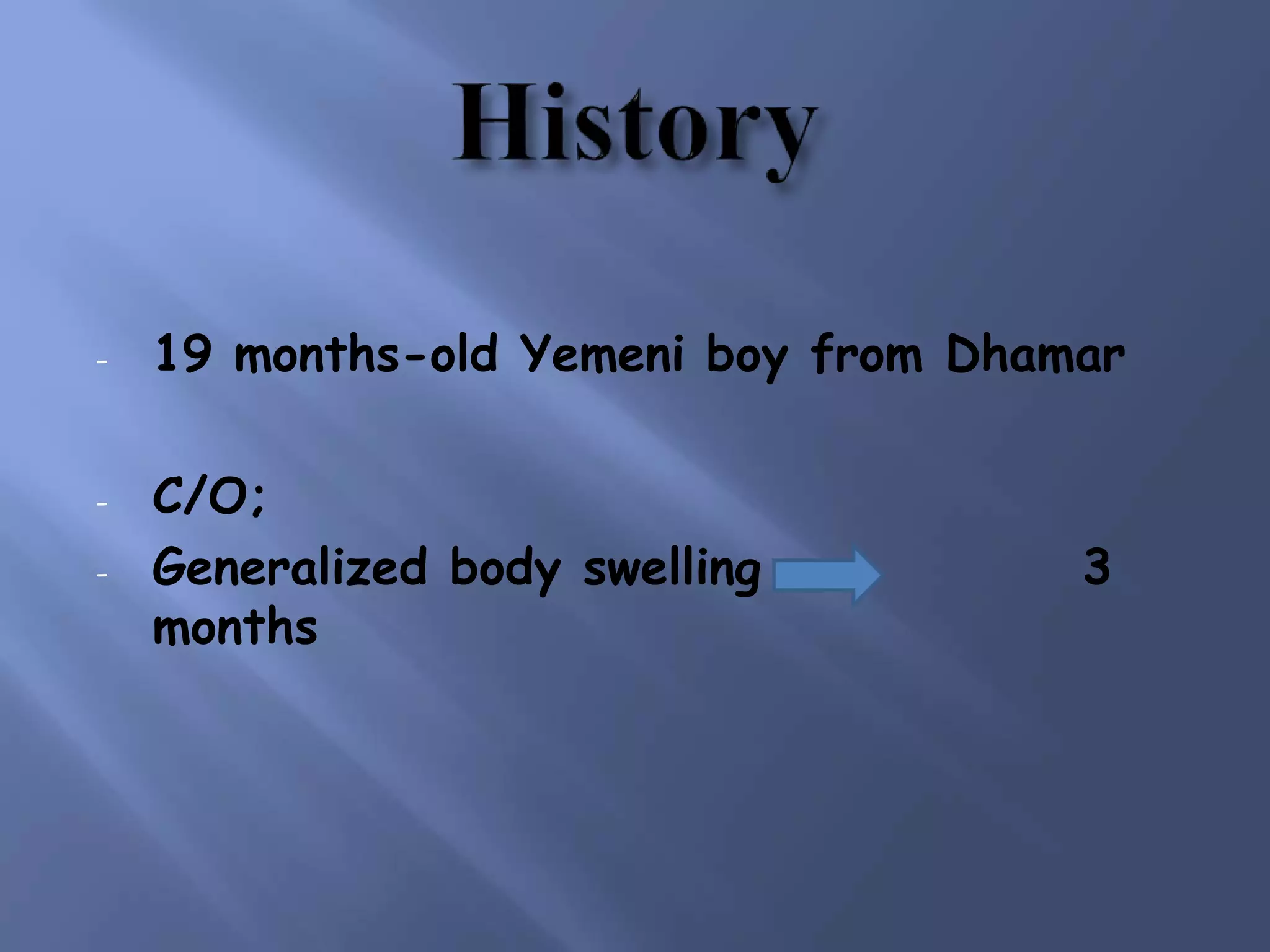 This document presents the case of a 19-month-old boy from Yemen who presented with generalized body swelling that had begun 3 months prior. On examination, he appeared ill with generalized edema, hepatomegaly, ascites, and jaundice. Investigations revealed anemia, elevated liver enzymes, and cardiomegaly on chest x-ray. Differential diagnoses considered included cardiac causes like restrictive cardiomyopathy or constrictive pericarditis, and hepatic causes. He was started on treatment for heart failure while awaiting heart transplantation for definitive management.