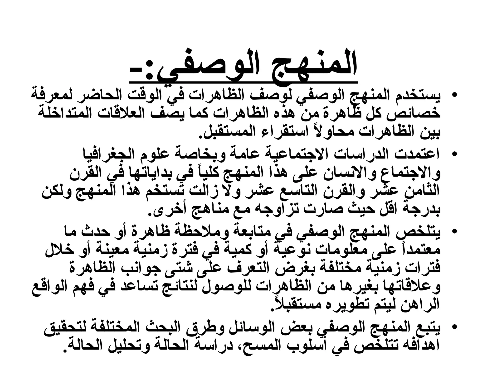 المنهج الوصفي يُستخدم لوصف الظواهر الراهنة وفهم خصائصها وعلاقاتها، وقد اعتمدت عليه الدراسات الاجتماعية في بداياتها. يقوم المنهج بجمع معلومات نوعية أو كمية باستخدام طرق مثل المسح ودراسة الحالة وتحليل المحتوى. على الرغم من تزاوجه مع مناهج أخرى، إلا أن له دوراً مهماً في تطوير الدراسات عبر الزمن.