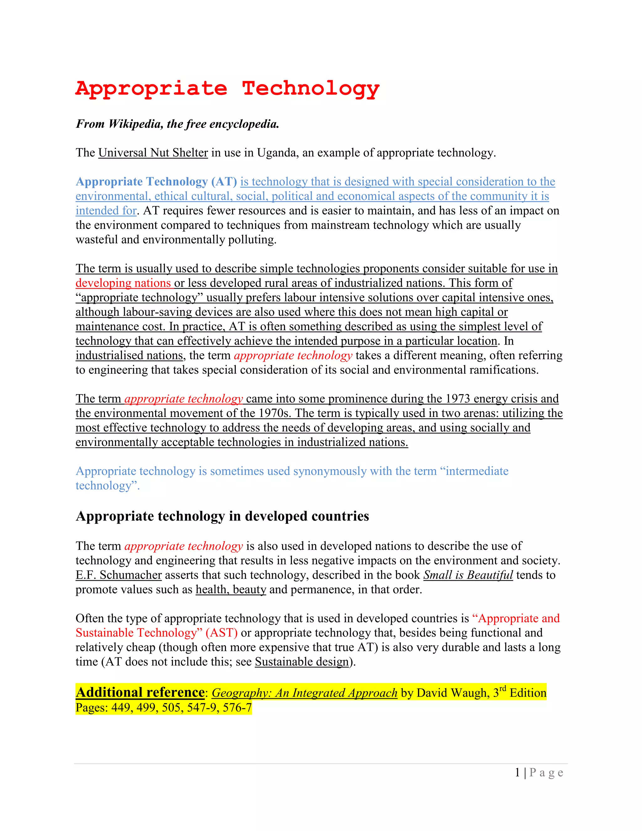Appropriate technology is designed to consider environmental, social, and economic factors of local communities. It uses fewer resources, requires less maintenance, and causes less pollution than mainstream technologies. The term is usually used to describe simple technologies suitable for developing nations or rural areas. In these contexts, appropriate technology prefers labor-intensive over capital-intensive solutions. In industrialized nations, appropriate technology refers to engineering with special consideration of social and environmental impacts. The concept gained prominence in the 1970s in response to the energy crisis and environmental movement. It aims to meet community needs in developing areas through effective technologies and use socially and environmentally friendly technologies in industrialized countries.