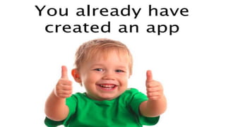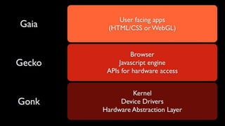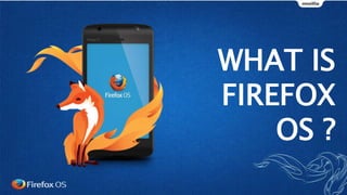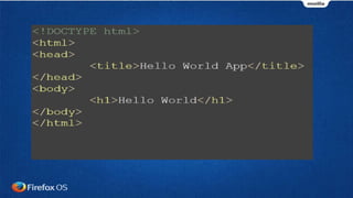 This document provides an introduction to developing apps for Firefox OS. It explains that Firefox OS apps are really just webpages that have access to device hardware and APIs. To get started developing, a developer needs a text editor, Firefox browser, Firefox OS simulator add-on, and WebIDE. Apps are built with HTML and CSS for the user interface and JavaScript for logic and programming. The document walks through creating a simple "Hello World" app and provides examples of common JavaScript APIs for building Firefox OS apps, including APIs for making phone calls, sending SMS, accessing sensors, manipulating files, and more.