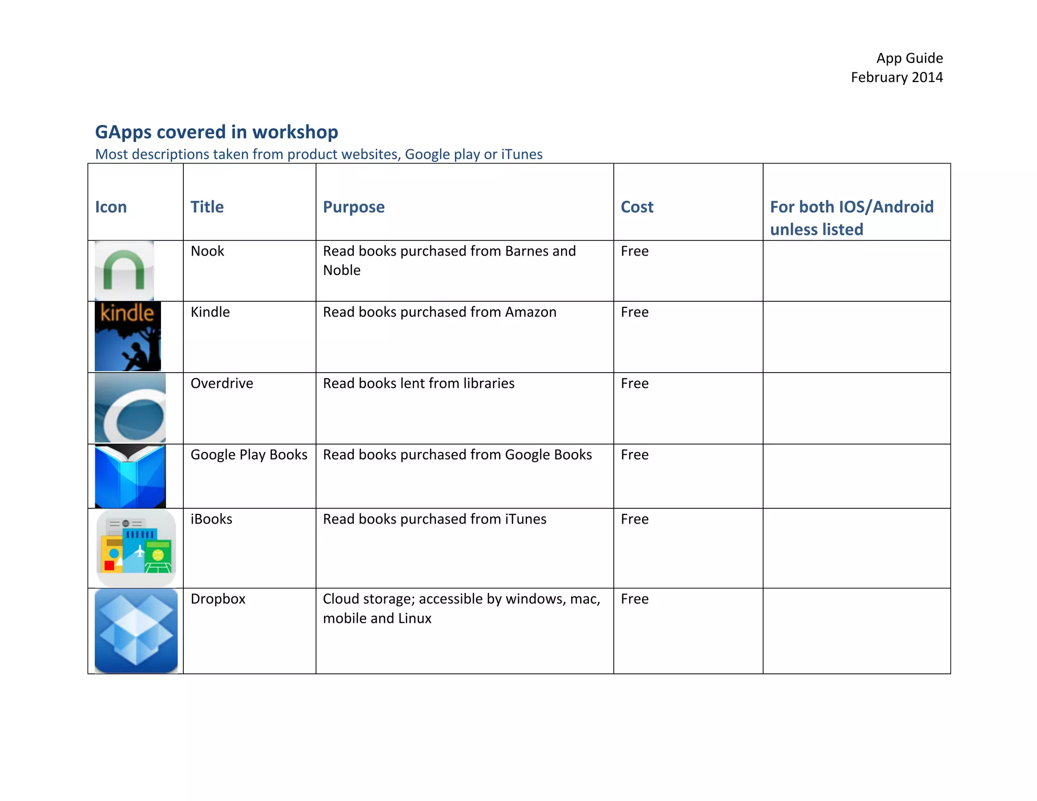 The document is an app guide from February 2014, detailing various applications for reading, productivity, social media, navigation, music, education, and more, including their costs and functionalities. It highlights free apps such as Google Drive, Evernote, and Duolingo, along with paid options like Microsoft Office and Khan Academy. The guide serves as a resource for selecting useful mobile applications across different platforms and purposes.