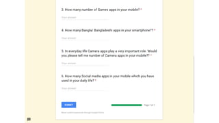 This document discusses the process of statistics and analyzing app usage data. It outlines the key steps as collecting data through surveys, using statistical formulas to process the data, and publishing the results. As an example, the document presents data on the number of apps in different categories used on Android and iOS platforms, showing Android dominating with 97.9% compared to IOS's 2.1%. It concludes by noting some of the challenges in conducting an effective survey and collecting accurate data.