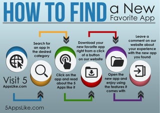Check out this step by step guide on how to find new apps that you have never heard of. 5Appslike.com will help you search for new apps like an app and discover new apps that you can download to your handheld device.