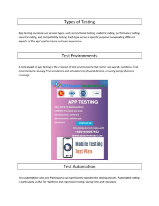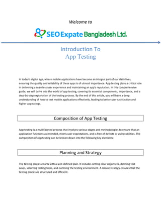 This document introduces app testing, emphasizing its importance in ensuring mobile applications are reliable and user-friendly. It covers the composition of app testing, including planning, various testing types, and the importance of creating effective test environments, along with a step-by-step guide for executing the testing process. By following these guidelines, developers can optimize app performance and enhance user satisfaction, ultimately leading to a successful app launch.