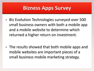 A survey of over 500 small business owners revealed that 73% prefer mobile apps over mobile websites for higher ROI, customer preference, and repeat business. Mobile apps provide better user experiences, access to device features, and customer engagement tools, while mobile websites are less expensive and easier to update. Businesses are encouraged to adopt both platforms for a comprehensive mobile marketing strategy to capture a wider audience.