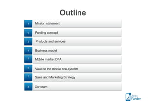 This document outlines Appsfunder's mission to provide a fast and cost-effective crowdfunding solution for mobile app developers. It describes Appsfunder's hybrid crowdfunding model and roadmap for offering services like a developer directory, web shop, AAA certification, and local versions. The business model relies on multiple revenue streams from crowdfunding success fees, subscription fees, resale margins, and certification fees. Sales and marketing will utilize an integrated approach targeting developers, funders, and partners. The team is led by founder Pascal De Keyser and includes partners covering key regions.