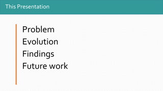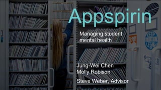 This presentation discusses developing an app called Appspirin to help manage student mental health. It aims to make accessing mental health care as easy as taking an aspirin. The presentation outlines the problem of underuse and overuse of counseling, explores stigma around mental health, and details the evolution of the app's scope from streamlining counseling appointments to stress tracking and reduction techniques. Findings show concerns around overmedication and mixed feelings about therapy. Future work includes fully developing the app, extending it to other universities, frequent updates, and pilot testing. The goal is to ease users into therapeutic strategies and help them independently manage their mental health.
