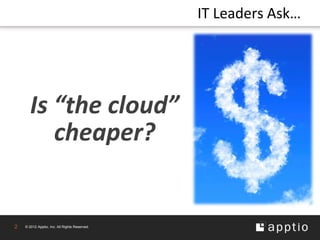 This document discusses public, private, and hybrid cloud models and strategies for determining the most cost-effective approach. It outlines six factors that cloud providers exploit to reduce costs: services orientation, capacity utilization, process efficiency, cost-effective architecture, accountability for cost, and transparency of consumption. Moving from traditional IT towers to selective cloud sourcing to full services transformation can help organizations better link costs to value and improve agility.