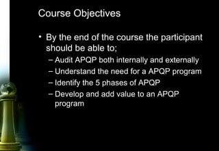 The document provides information on Advanced Product Quality Planning (APQP) and its 5 phases: 1) Plan and Define Program, 2) Product Design and Development, 3) Process Design and Development, 4) Product and Process Validation, and 5) Feedback, Assessment and Corrective Action. It describes the objectives and key activities that should be completed in each phase of the APQP process.
