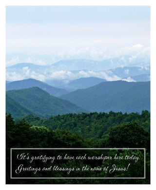 This bulletin from Knightdale Baptist Church provides information for their worship service on April 6th, 2014. The service includes praise songs, prayers, scripture reading, a message by Rev. Trent Sessoms, and a response song. Announcements provide details on upcoming church events, volunteer schedules, and ministry updates. The budget report shows current financial information and attendance numbers from the previous Sunday.