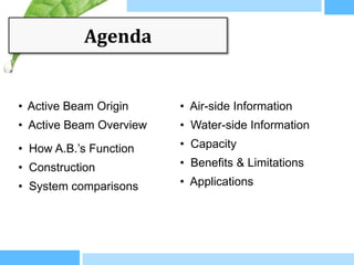 The document discusses active beam systems, including their origin, overview, function, construction, comparisons to other systems, air-side and water-side information, capacity, benefits, limitations, and applications. Active beams are a hydronic system that uses water to transport energy and induce room air through nozzles to provide heating or cooling. They can provide significant fan energy savings compared to all-air systems while maintaining thermal comfort. Proper design of the air-side and water-side is important to control humidity and achieve capacity.