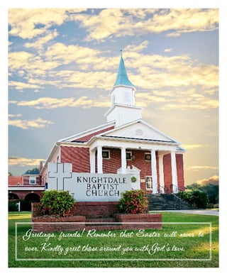 The document announces the worship service for the Second Sunday of Easter at Knightdale Baptist Church, including the order of service, announcements about upcoming church activities, and the weekly church schedule. It provides information for members and guests about the day's worship service and opportunities to get involved in the life of the church.