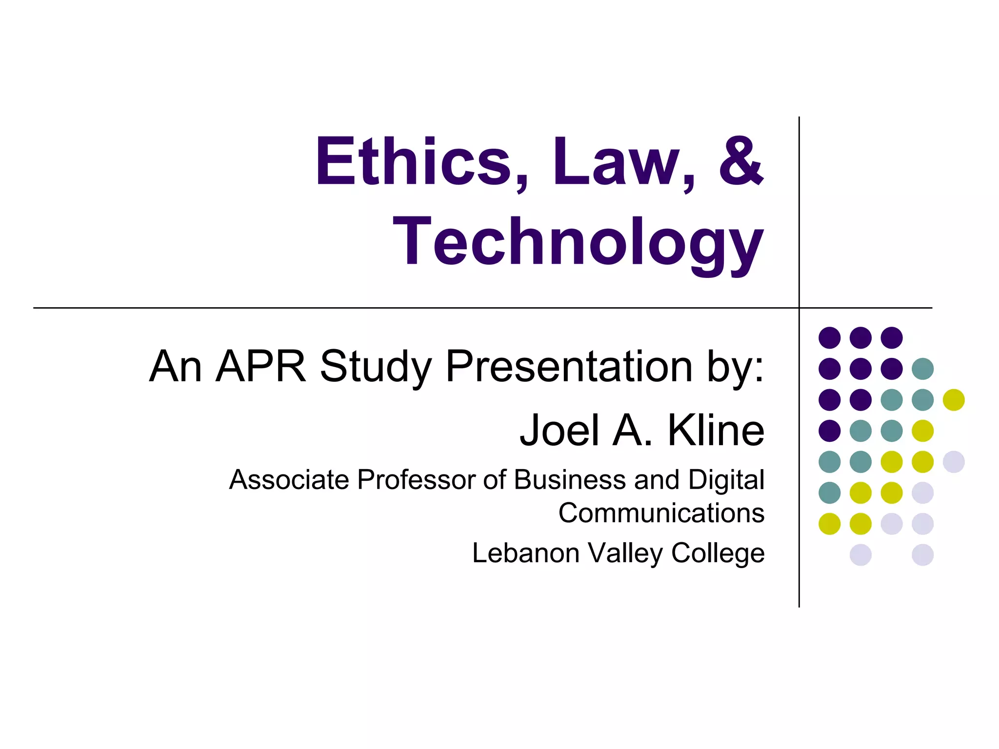 This document provides an overview of ethics, law, and technology as they relate to public relations. It discusses general ethical principles like honesty, integrity, and protecting privacy. It also examines the relationship between law and ethics. On the legal side, it outlines concepts like the First Amendment, freedom of information laws, copyright, and privacy laws. It provides examples of legal cases and defines key terms. For technology, it briefly discusses the role of blogs, websites, and content management for PR professionals. The document is intended as a study guide for an accreditation exam on ethics, law and technology in PR.