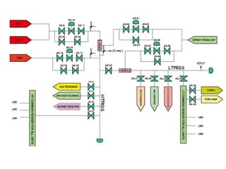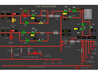 The document describes the auxiliary PRDS (pressure reducing and desuperheating) system used in thermal power plants. It has two identical systems - the turbine auxiliary steam system (TAS) and boiler auxiliary steam system (BAS). Low and high capacity auxiliary steam is derived from main steam and its pressure and temperature are reduced before supplying it to various locations in the plant for processes like deaeration, soot blowing, oil heating etc. The systems use control valves, isolating valves, desuperheaters and spray water to control pressure and temperature.