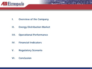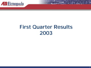 The document summarizes Eletropaulo's first quarter 2003 results. It provides an overview of the company, noting it is Brazil's largest electricity distributor serving over 5 million consumers. It reviews the energy distribution market and Eletropaulo's operational performance, including increased consumption and changes in consumer profiles. Financial indicators and the regulatory scenario are also examined.
