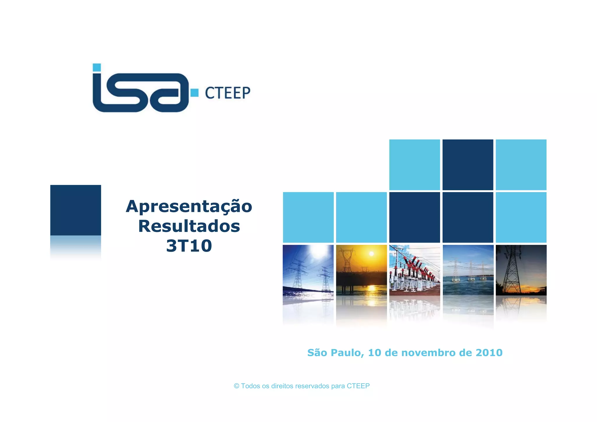 The document summarizes the key highlights and financial results of CTEEP for 3Q10. It notes that revenue remained stable year-over-year despite tariff adjustments. Costs increased mainly due to a salary increase in August 2010. Net income was R$1.34 per share for 3Q10. Total debt was R$1.05 billion at the end of 3Q10, with long-term debt maturities well spaced out through 2023.