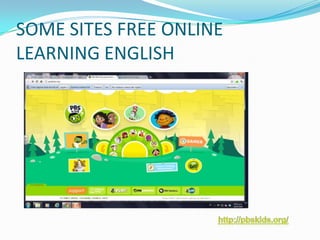 This document lists some free online resources for learning English, including games, videos, songs, and activities. Games and interactive pages allow learning through play and innovation. Videos can be accessed through PBS Kids. Songs are available on YouTube. Activities with printable materials are provided by PBS Kids and Toopy and Binoo.