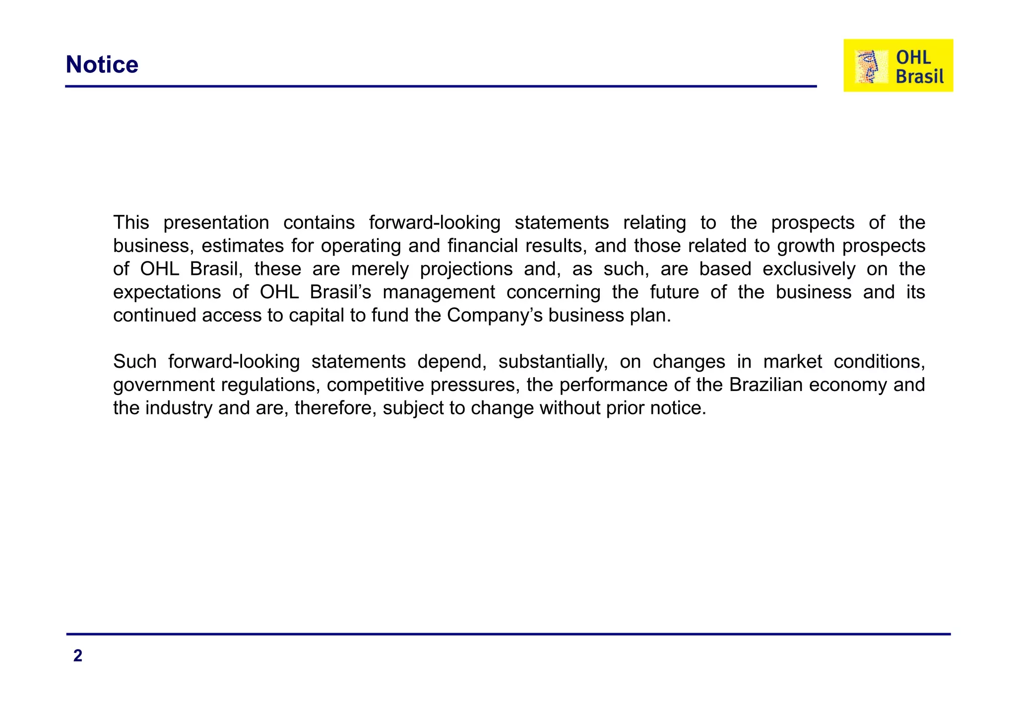 - During the second quarter, 5 new toll plazas began operating in OHL Brasil's federal concessions, bringing the total to 27 out of 29.