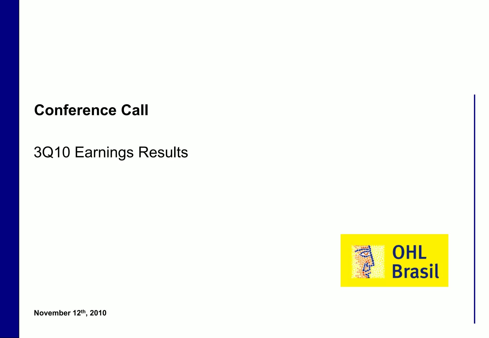 This document summarizes the 3Q10 earnings results of OHL Brasil. It shows increases in vehicle traffic across OHL Brasil's state and federal road concessions compared to previous periods. Revenue, EBITDA, and net income all increased for 3Q10 compared to 2Q10 and 3Q09. The document also provides details on debt levels, financial results, and toll tariff information.