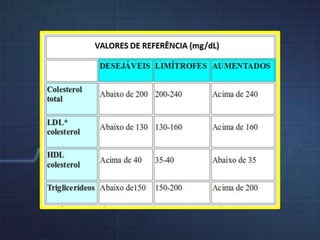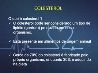 O documento discute o colesterol, incluindo sua estrutura, funções, tipos (LDL e HDL), doenças relacionadas como aterosclerose, diagnóstico e tratamento. Explica que o colesterol é produzido pelo corpo e obtido pela dieta, liga-se a lipoproteínas, e níveis altos estão associados a doenças cardíacas.