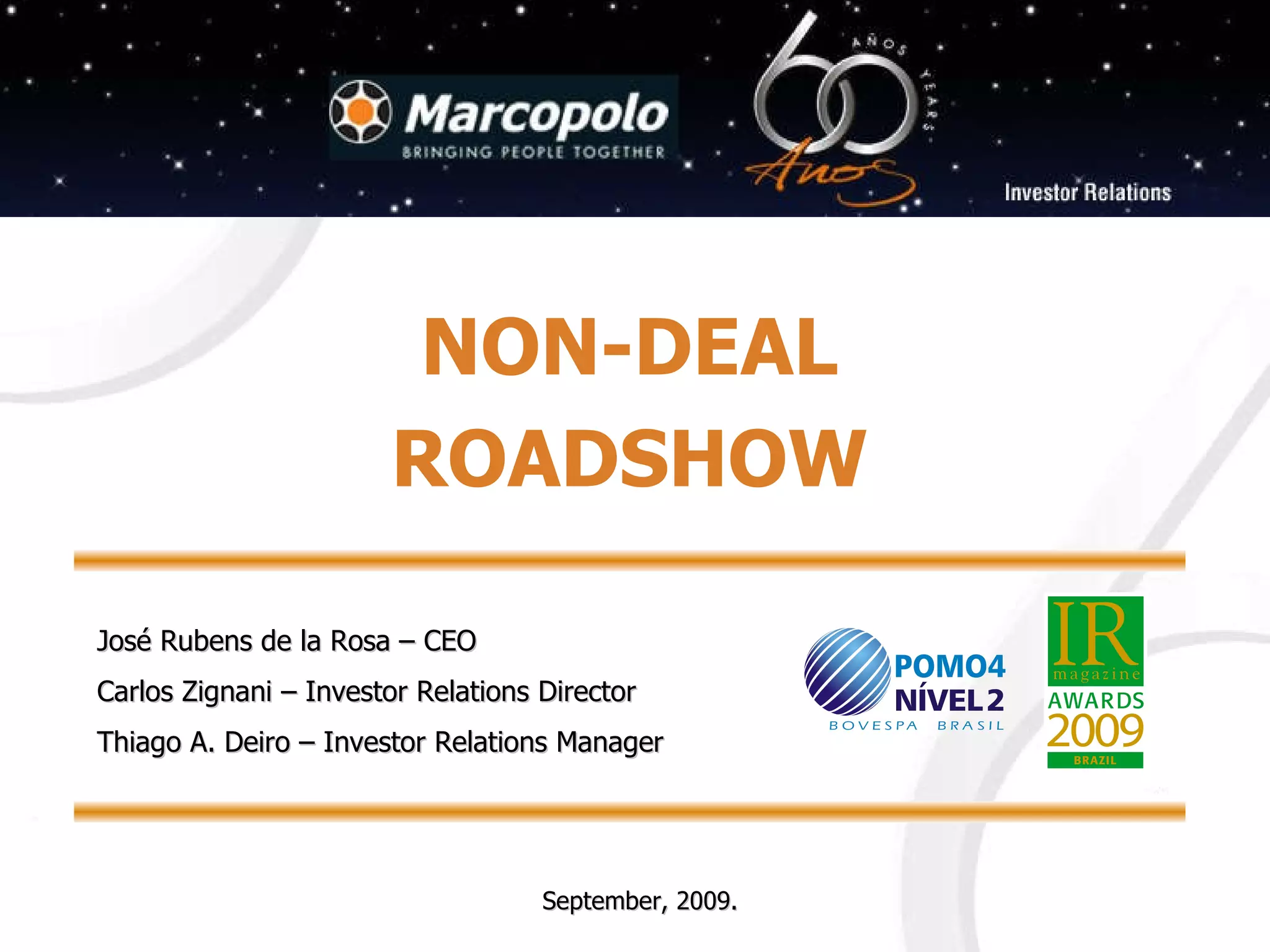 This document provides an overview of Marcopolo S.A., a Brazilian bus and coach manufacturer. Some key points: