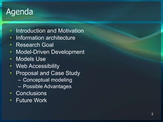 This document discusses a model-driven approach to improving the accessibility and organization of wiki content. The researchers propose using conceptual models and transformations to automatically generate wiki code with structured namespaces, pages, and menus. This aims to help non-technical users more easily plan and create an intuitive information architecture for wikis. The models focus on accessibility elements to reduce barriers for diverse users. While wikis are flexible, their content can be difficult for new or disabled users to understand and navigate. The proposed approach generates wiki code from conceptual models in order to better support users in organizing content.