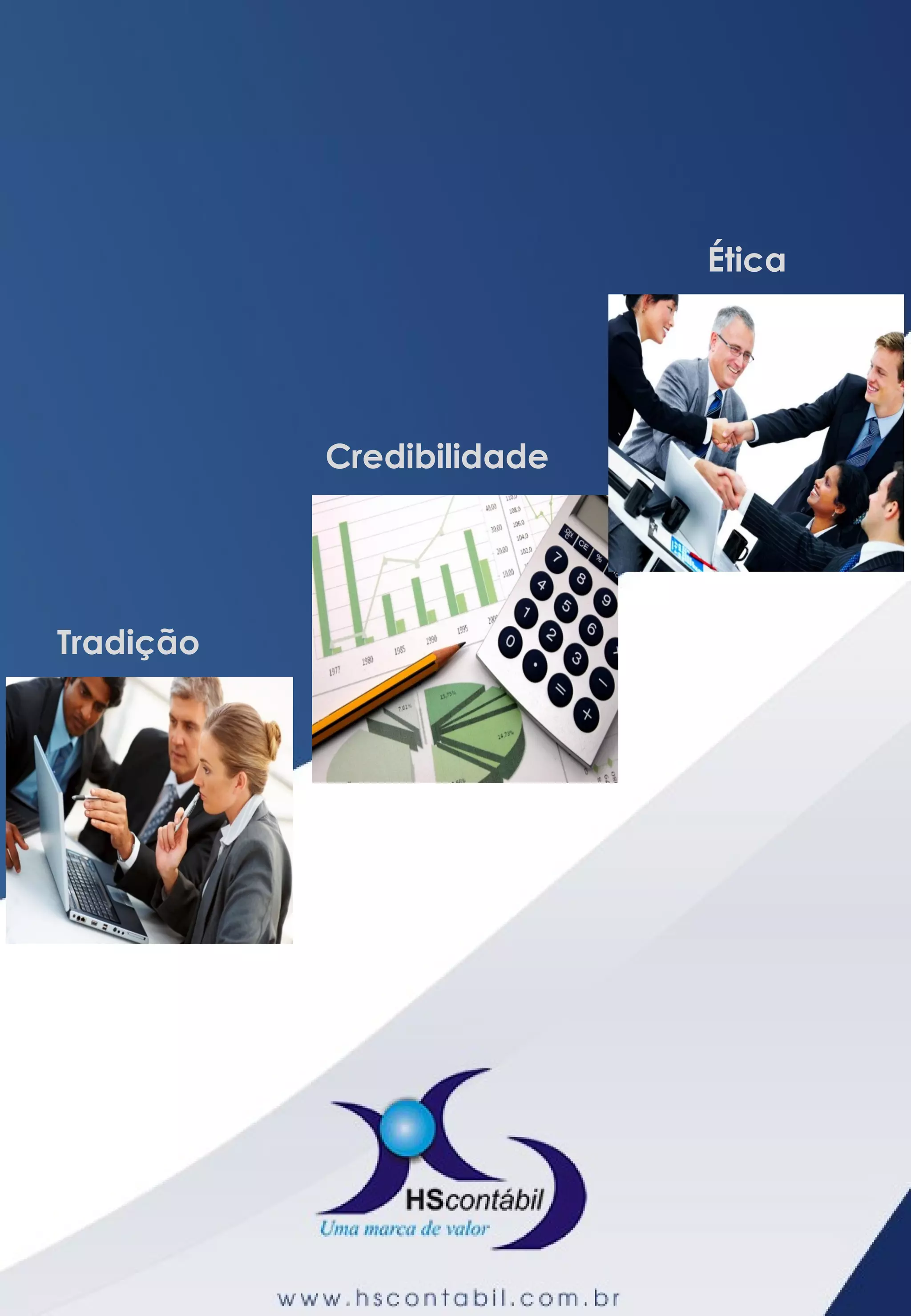 Este documento apresenta as informações sobre a empresa HS Contábil, incluindo sua missão, visão, metas, serviços oferecidos, história, certificações e estrutura. A HS Contábil é uma empresa de contabilidade com mais de 40 anos de experiência que busca a excelência nos serviços prestados por uma equipe altamente qualificada para atender clientes de diferentes setores.