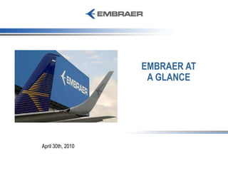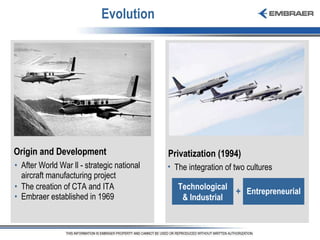 This document provides an overview of Embraer S.A., a Brazilian aerospace conglomerate. It discusses Embraer's history and evolution, operational facilities around the world, product lines including commercial and executive aircraft as well as defense systems, technologies, environmental initiatives, financial performance, and employee benefits.