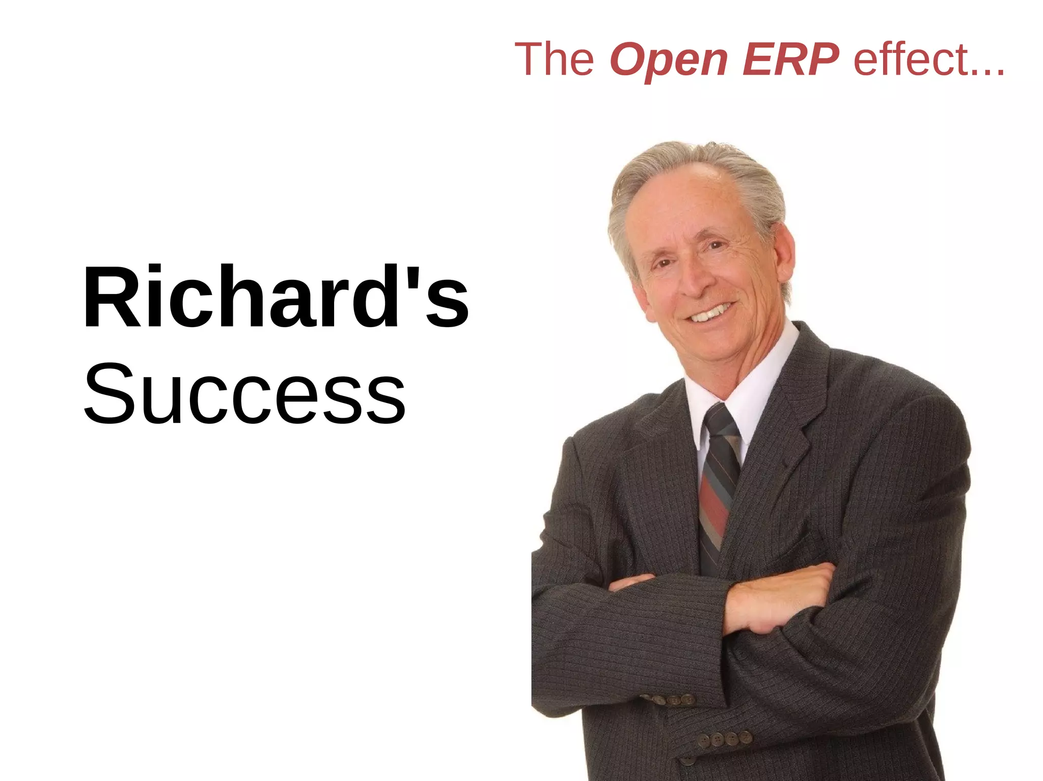 The document describes how Richard, a company founder and manager, implemented Open ERP software to integrate all of the business processes and applications at his growing manufacturing company. This allowed the company to reduce costs, improve efficiency, and continue growing while maintaining control and visibility across all operations. The new integrated system helped save costs, streamline employees' tasks, and even allowed new offices to be launched quickly.